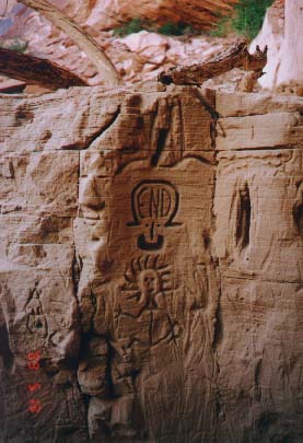 There were a number of campers near the Arch and a whole tent city in the ricon before the arch. Some school kids I guess. Heather and I arrived at the beach near Jacob Hamblin Arch at about 1:00 in the afternoon and we sat around in the shade vegging out. Heather climbed up into the arch and walked around back into a hidden alcove high up in the arch - finding a place where hikers carved their name and the date they were in the canyon. She said that many hikers had put their names and then listed year after year, each time they came into the canyon. She wanted to be able to do that so she carved her name into the sandstone, along with the date - forever immortalized as a "hikerglyph".