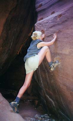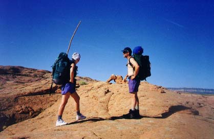 When she climbed down I asked her to speak with some fellows at the beautiful site where Larry Calloway and I had watched a full moon rise through the arch one magical night years ago. I wondered they would allow us to camp in the area. They told her that they would be leaving the canyon later that afternoon and offered the whole site to us. At about 4:00 they packed up, along with a couple of other guys who were sitting in camp chairs near them and left to hike out the moqui steps (carved indentations in the rock) located nearby. We followed the two groups to watch them climb out. On the way up, they met with 2 girls and their 2 dogs who also intended to climb out. Heather and I walked around on the slickrock to see if we could get enough grip to climb out. She wanted to try it, so I made her put on my runners (she was still wearing her sandals which she hiked in every day since we got out of Buckskin!!!). She was able climb out, unencumbered by her backpack, and she waited above and I waited below to watch the three good climbers and 4 scared hikers ladened with their backpacks attempt the climb. One young fellow with a huge pack, who appeared to be about 28, turned to me and said that he didn't mind telling me that he was scared shitless. The dogs had no problems once they were encouraged to go up. One of the climbers helped the backpackers up the steep slickrock. Heather said the backpackers were so afraid of falling that their arms and legs were shaking as they passed her. When they all finally made it up, Heather and I clapped and she scuttled back down in a crablike fashion. It took about 2 hours for the hikers to sort their way up.