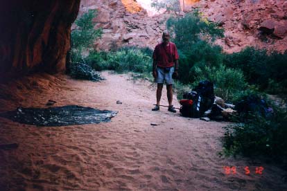 It was just beginning to get dark as Heather and I returned to the lovely campsite only to find that someone else's gear was there (tucked away). We sat down for a minute to sort out whether to wait for the hiker to return to ask if we could stay or move on. Around the corner walked Jim - a hiker from Seattle whom we had met a week earlier in southern Utah at the confluence of the Buckskin and Paria on our previous hike. He'd walked down Coyote Gulch to the Escalante River that day. He said he dreaded returning to his campsite as he expected to find a mob of people had moved in. When he saw only Heather and I - he was surprised and delighted, as were we, because he offered to let us camp there with him.